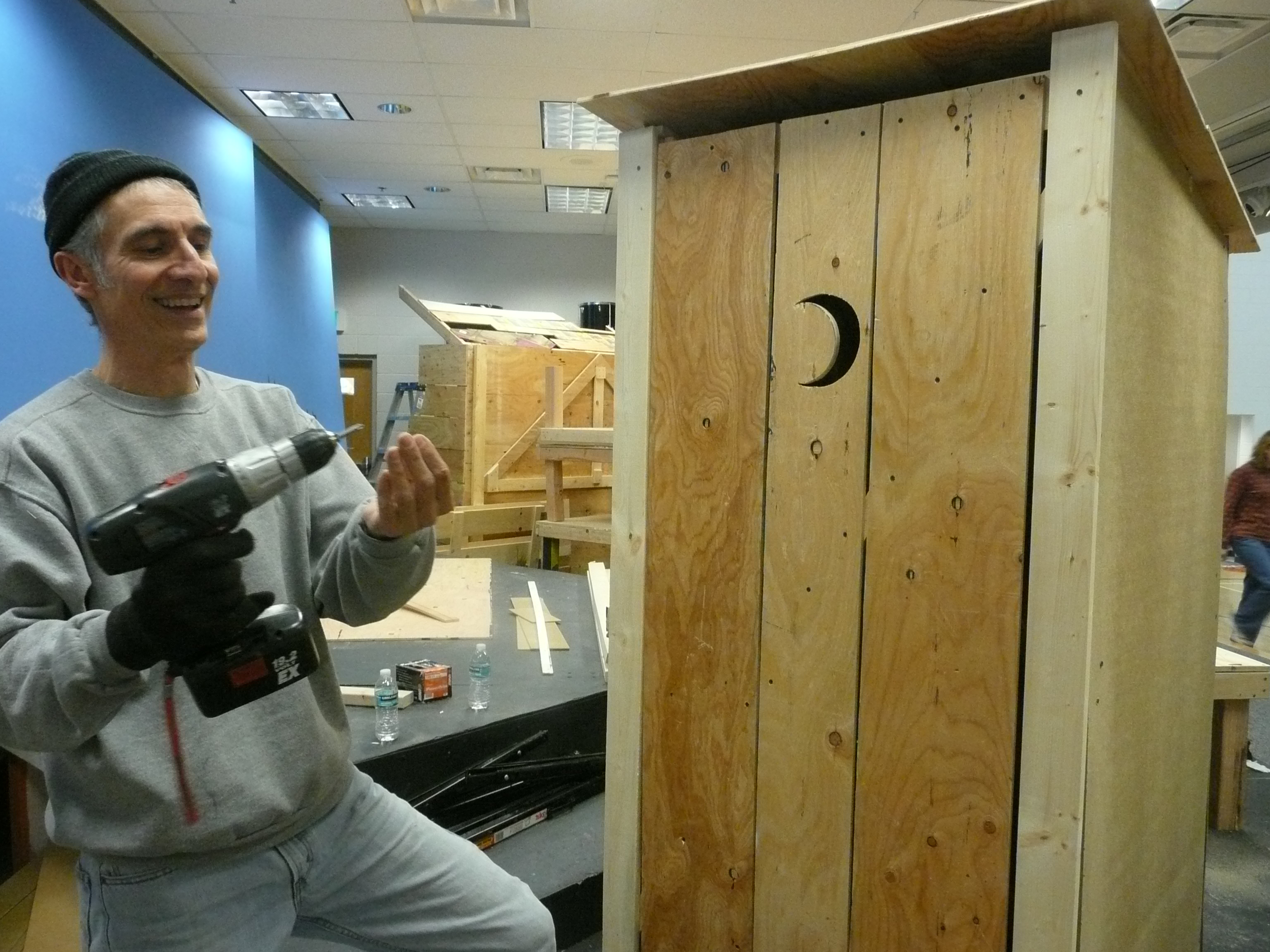 Joe Rotondo helps build an outhouse for the school play “Oklahoma” after all the sets, props and costumes were destroyed in a New Year’s weekend fire at the Challenge School.